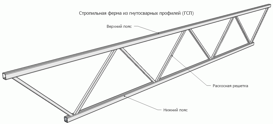 Элементы, составляющие ферму: опорный раскос (шпренгель), раскос, пояс и стойка.